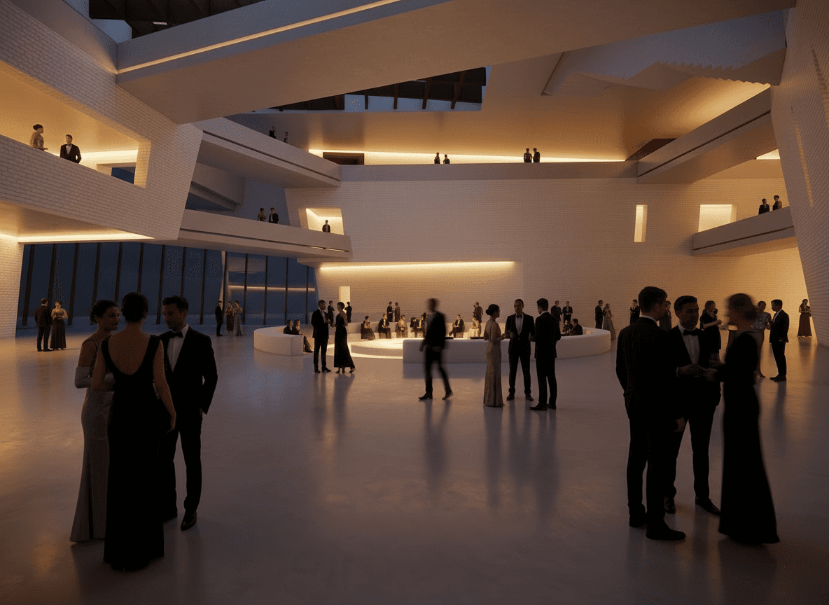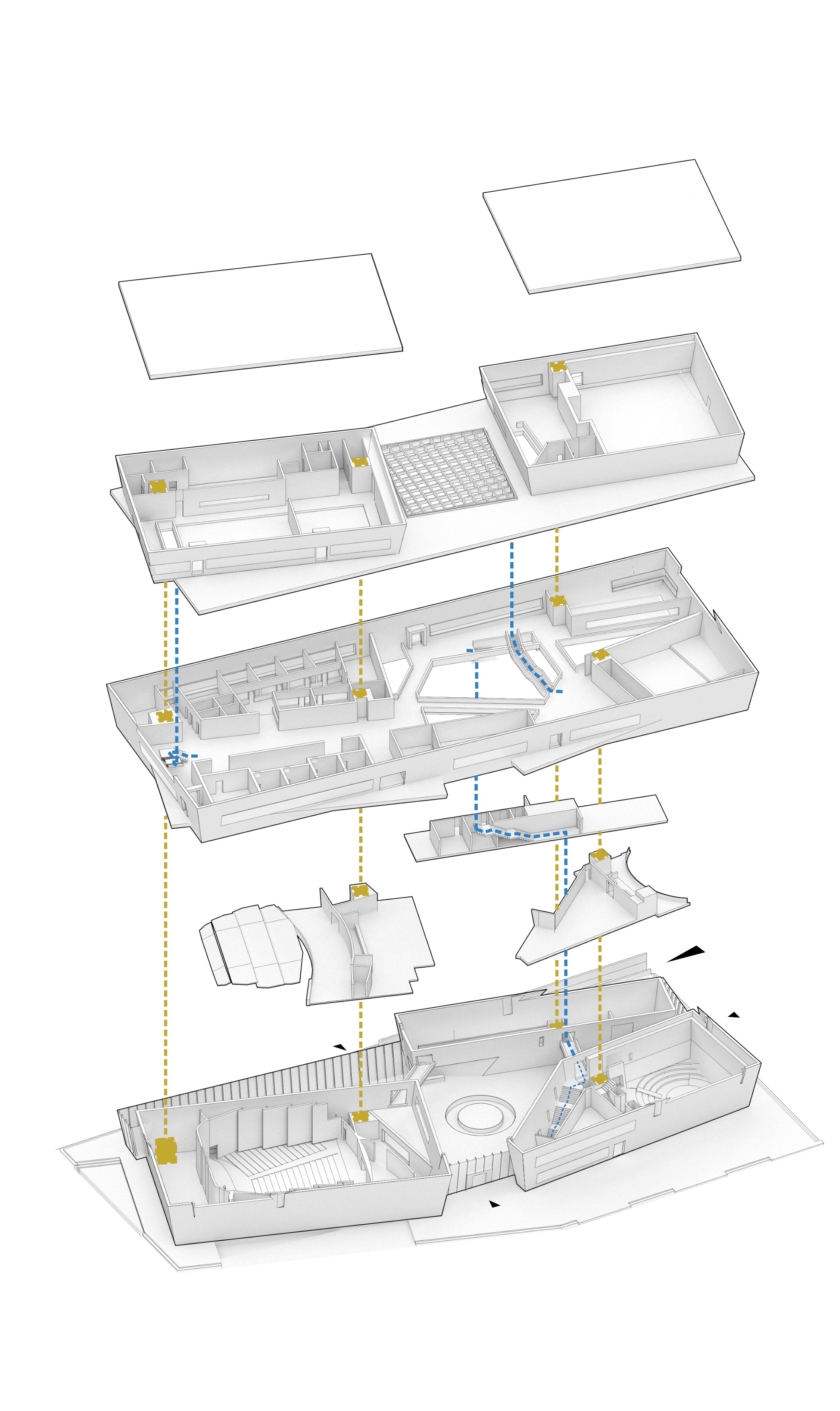 The volumes are stacked around a central void that functions as an open stage and lobby, forming the social core of the building and connecting levels through bridges and balconies. The program includes concert halls, studios, offices, and public spaces such as a jazz bar, restaurant, and rooftop terrace, ensuring activity beyond performance hours.